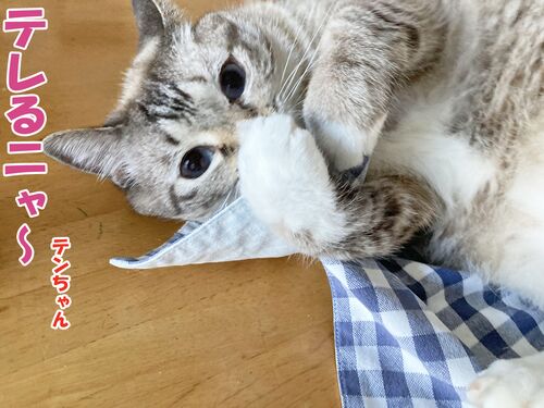 テンちゃんなぜワタシのランチョンマット抱きしめてるの? テレるニャ~ なぜテレる? イケメンニャ! リンゴが? リンゴくんて名前なんだニャ! リンゴという食べ物ですけどね。 見れば見るほどイケメンニャ! ワケがわからんですね。 イケメンは匂いもイイ…